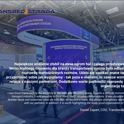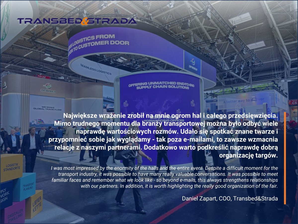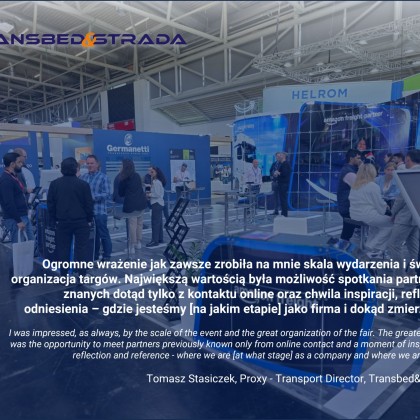 „Targi w Monachium po raz kolejny pokazały jak olbrzymie znaczenie we współczesnej globalnej gospodarce odgrywa transport i logistyka. To co robi wrażenie to niesamowity postęp i digitalizacja branży. Z roku na rok widać jak wiele jest innowacyjnych rozwiązań. Z drugiej strony mocno akcentuje się kwestie zrównoważonego rozwoju. Mimo trudnych czasów branża spogląda w przyszłość z nadzieją i optymizmem czego potwierdzeniem były liczne spotkania z partnerami biznesowymi i potencjalnymi klientami. Targi pokazały, że dziś w bardzo wymagającej globalnej gospodarce trzeba się spotykać, rozmawiać i w ten sposób kształtować wspólną przyszłość. Wymiana doświadczeń, otwartość na nowe pomysły, budowanie długofalowych relacji biznesowych to klucz to sukcesu dla całego środowiska TSL. Na targach czuć było „wspólną chemię” co potwierdza tylko siłę tej branży!”